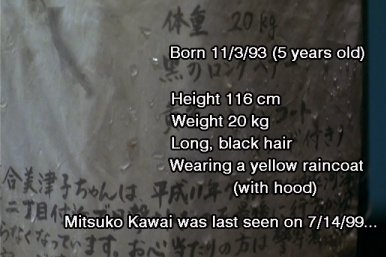 Yoshima is very late in picking her daughter up from school. She sees a “lost child” poster describing a young girl in a yellow raincoat.