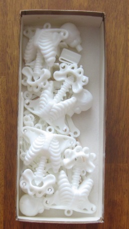 The inside of the box showing the glow-in-the-dark bones and wooden stakes.