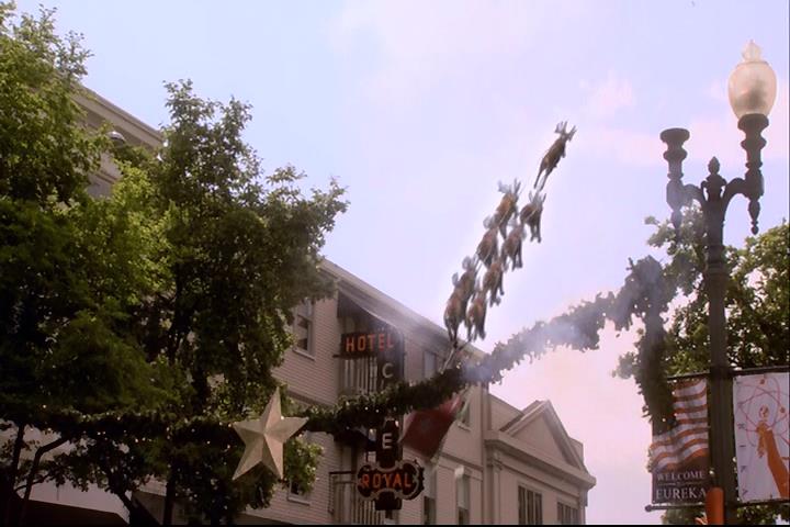 Jack is telling a story to keep some kids interested who weren't able to leave Eureka for a Christmas vacation. One year he and Zoey were trapped in Eureka for Christmas due to a malfunction of the protective shield around Eureka. Suddenly there's a warning about a possible air assault against the city. Jo takes her place with the security team.