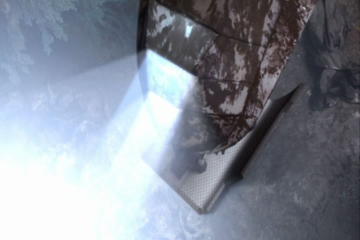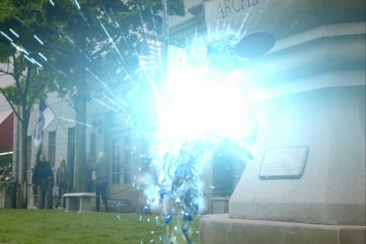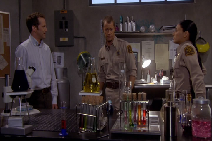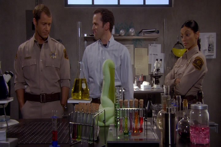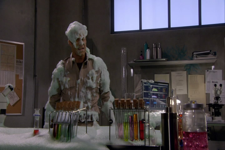 The building shakes, chemicals spill, and Carter gets covered by the fake mucus.