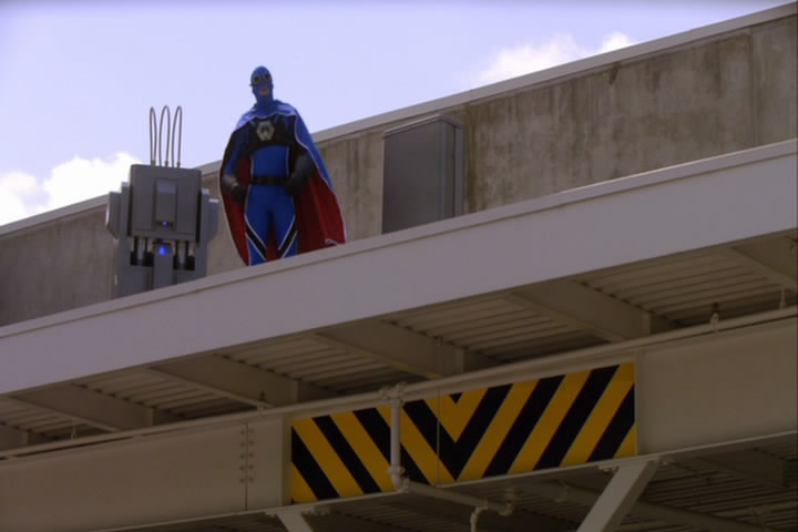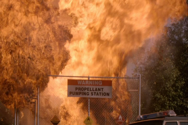 Carter runs into a situation where a rocket propellent station blows up due to the communication device that Fargo is making him wear. Captain Eureka shows up and puts the fire out (but manages to destroy Carter's jeep. He also walks through the metal fence.