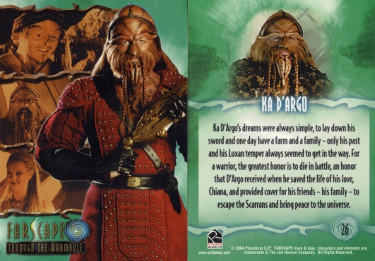 The back of the first card reveals how D'Argo ended up labeled as a criminal. He and Chiana had a sexual relationship, but that was all smashed when he found out his son was also have a sexual relationship with Chiana.