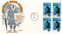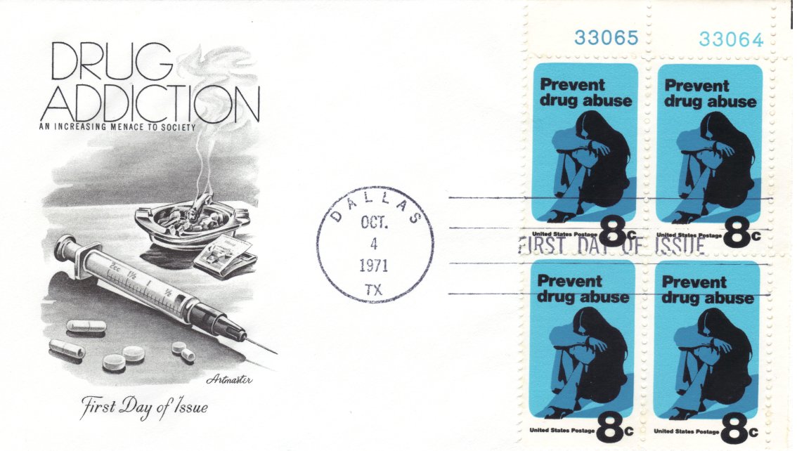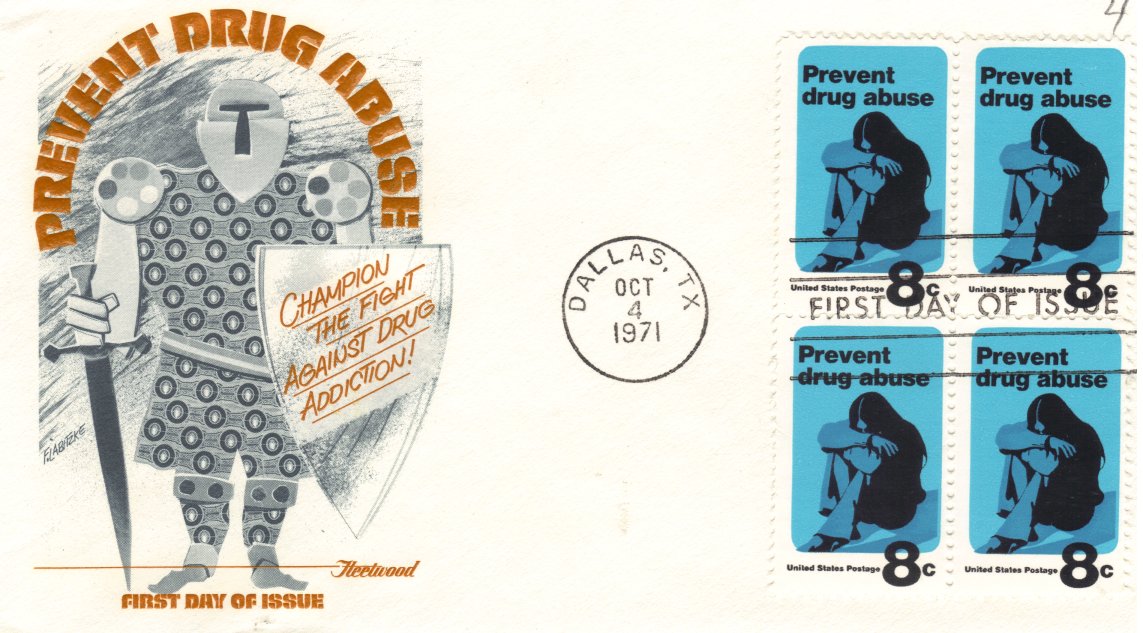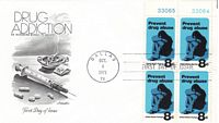 The date on these covers is October 4, 1971. The cachet on the first one is again of a type of artwork that I don't really care much for. The stamp, though, is quite good, presenting the darkness of such an addiction.