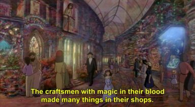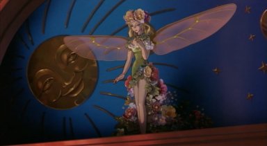 Once inside the store, she finds what appears to be the statue of a cat. The owner of the store appears and makes a repair to a magnificent old clock. It has moving dwarf-figure inside it, a fairy that appears at the top and other wonders.