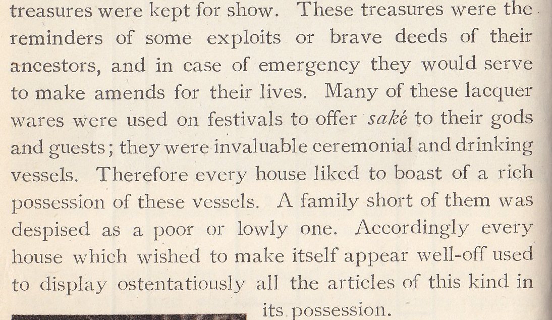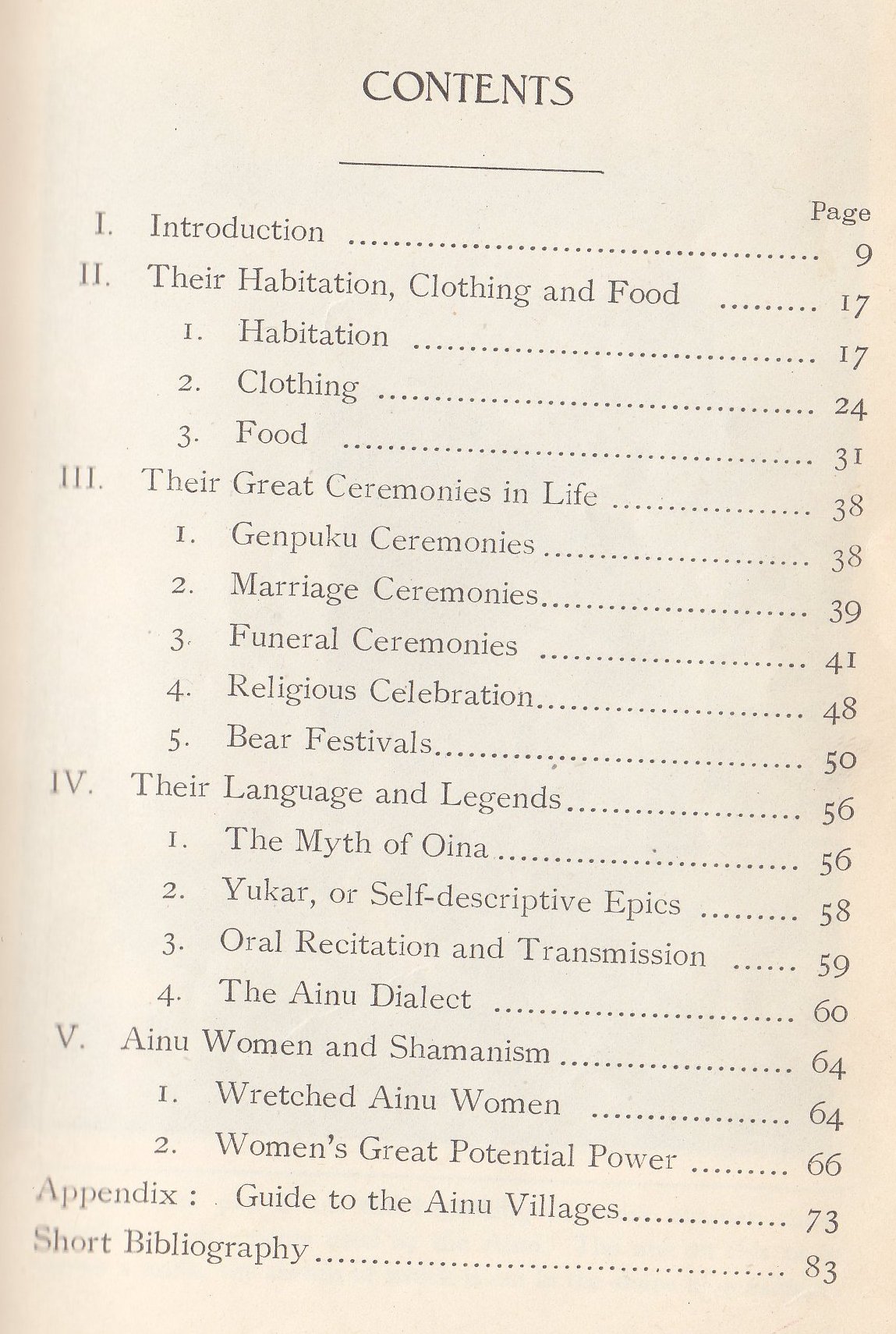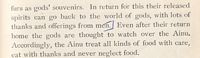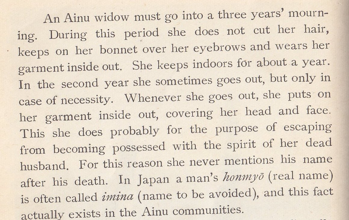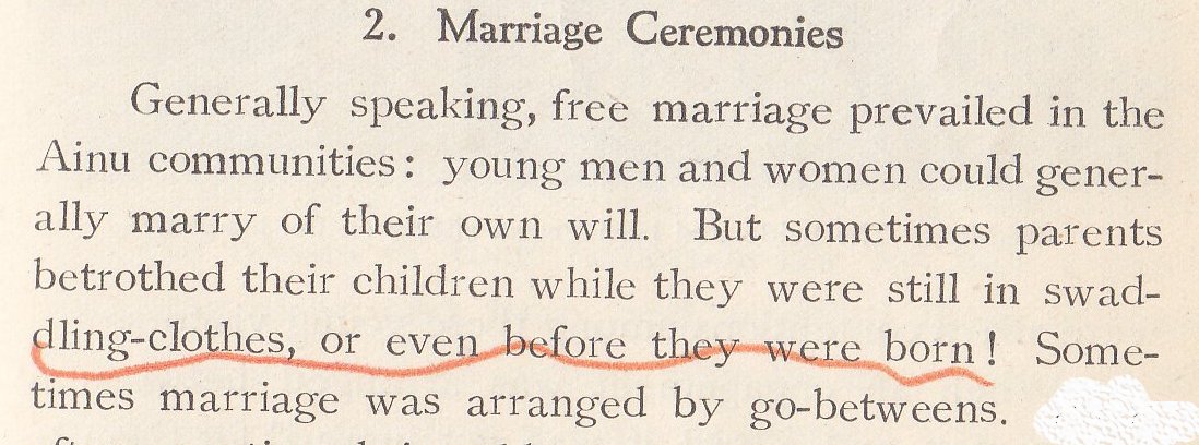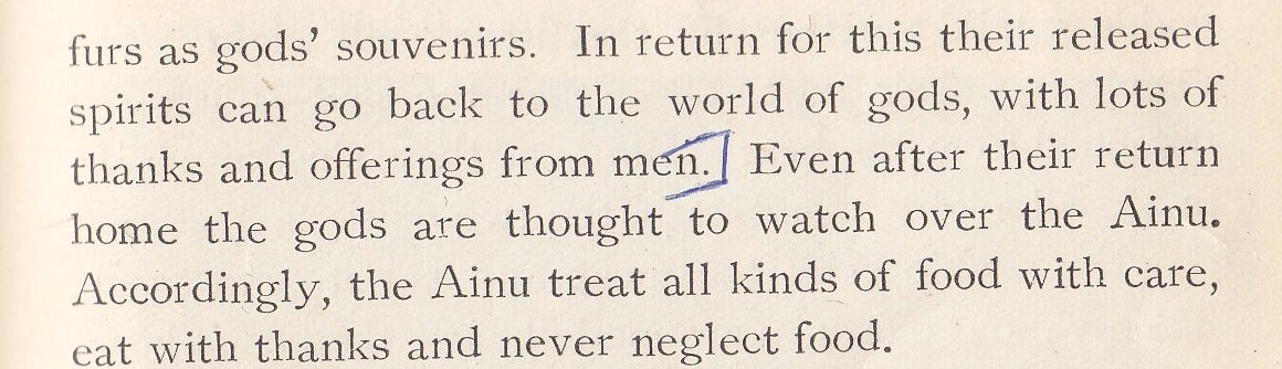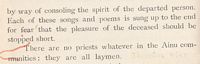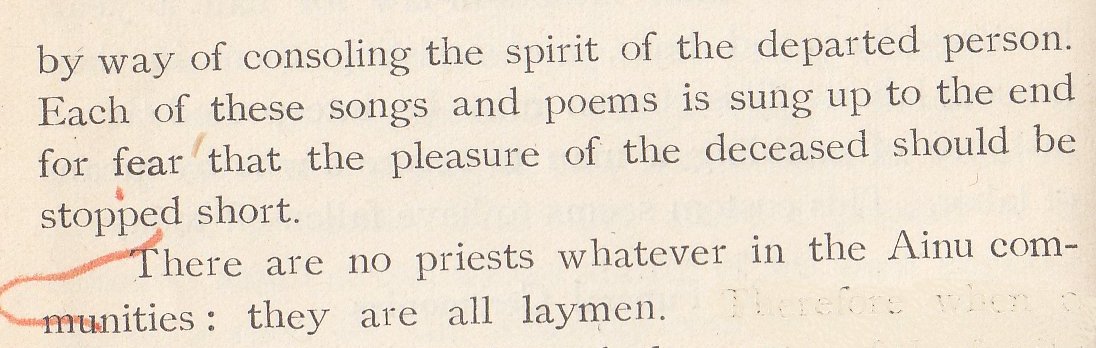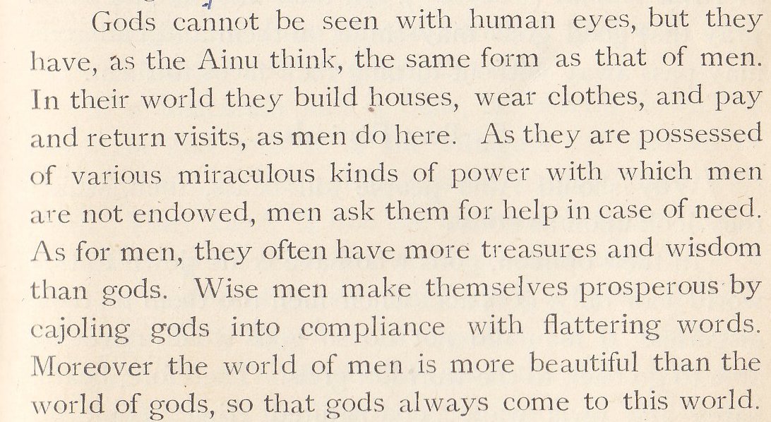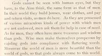 Religious celebration is the next topic, the author pointing out that the Ainu have neither temples nor shrines.