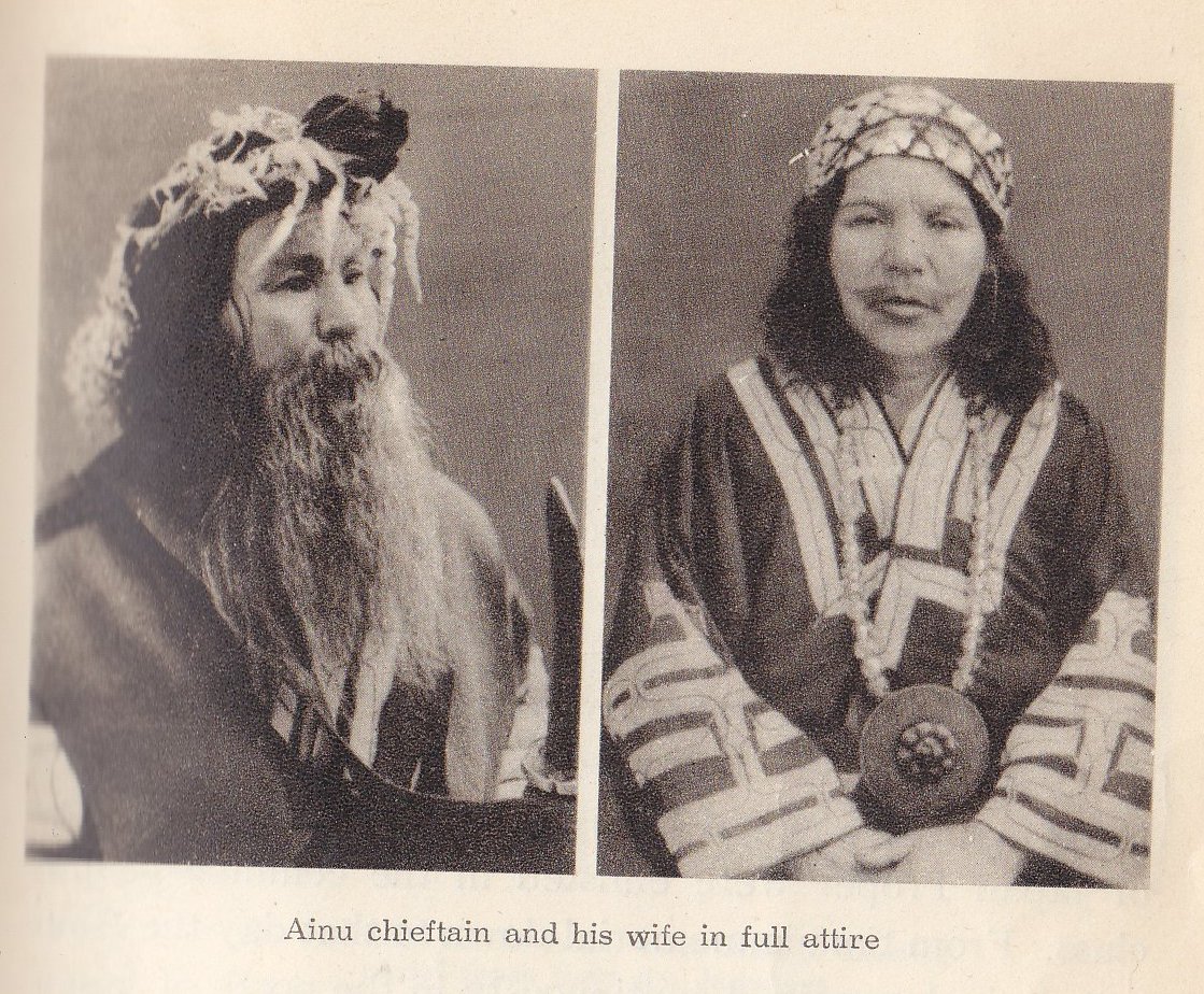 A chief and his wife. Note the long beard on the, common to the Ainu but not to the Japanese. The women also have a tattoo around their mouth.