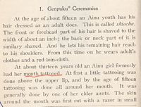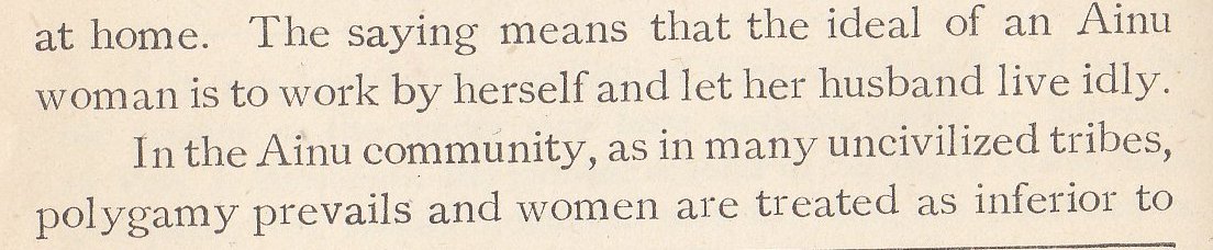 The author's remark on the hairiness of the Ainu. He then goes on to talk about how the Ainu are possibly of the Caucasian race, at least according to thinking of the time. He says that they are basically Stone Age people, and how the chieftain is determined.