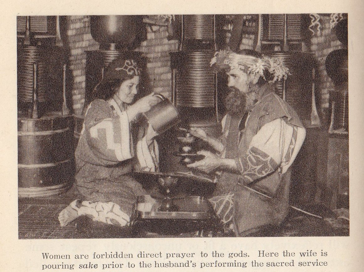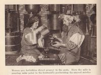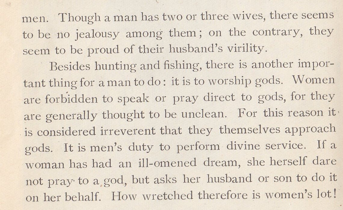 In addition, women are thought to be 'unclean' and they cannot speak or pray directly to the gods. On the other hand, shamans are supposed to be women (which doesn't make any sense; a shaman that never deals with the gods). Actually, every woman is thought to be a potential witch. The women also have a role in the passing down of oral stories.