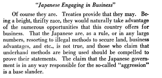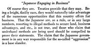 He says that those who believe the Japanese are using illegal business practices should be required to prove that they are. He also adds that the idea that the Japanese were “displacing” white workers was really nothing other than “the sense that every man is a competitor with every man who engages in the same occupation...”