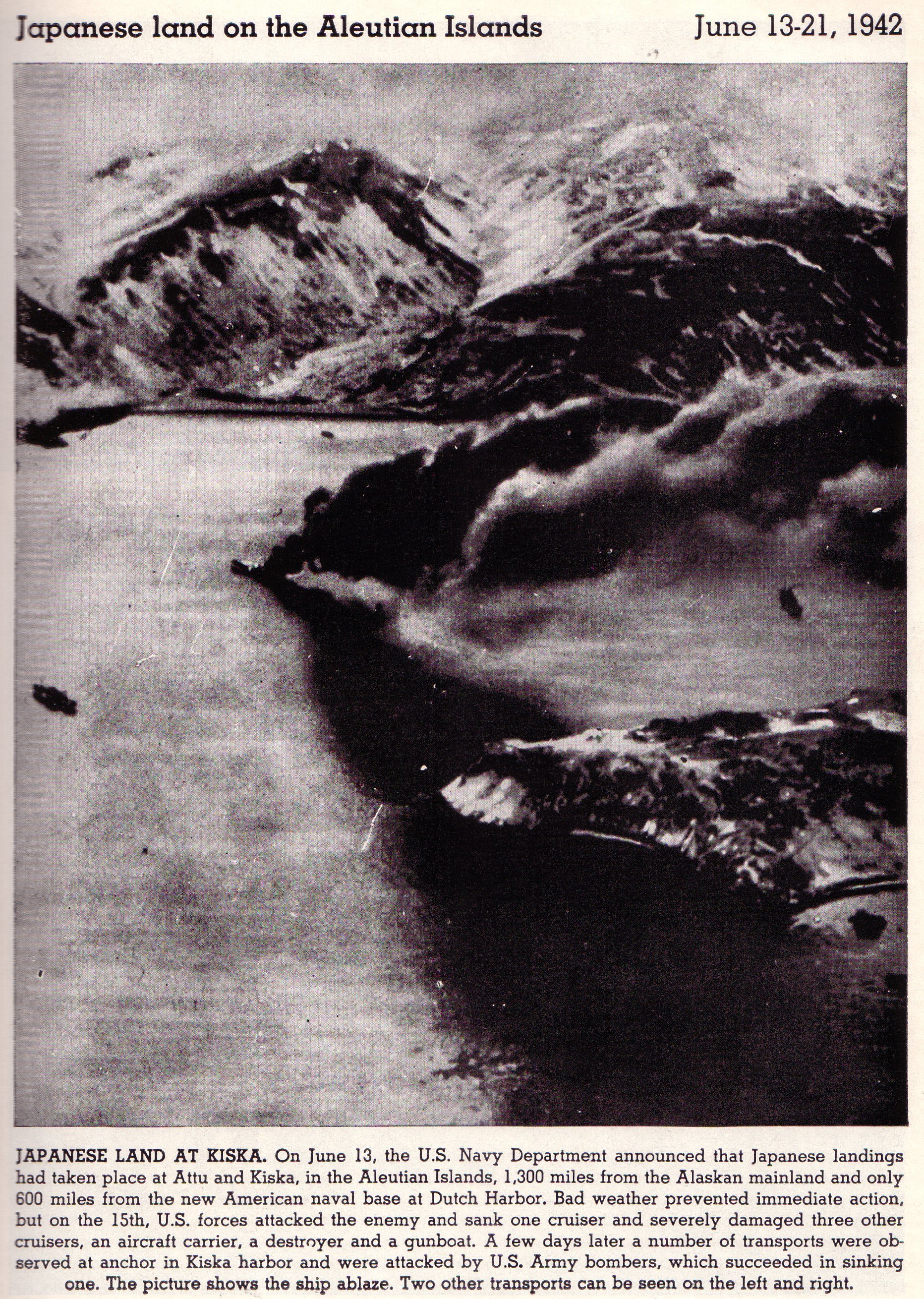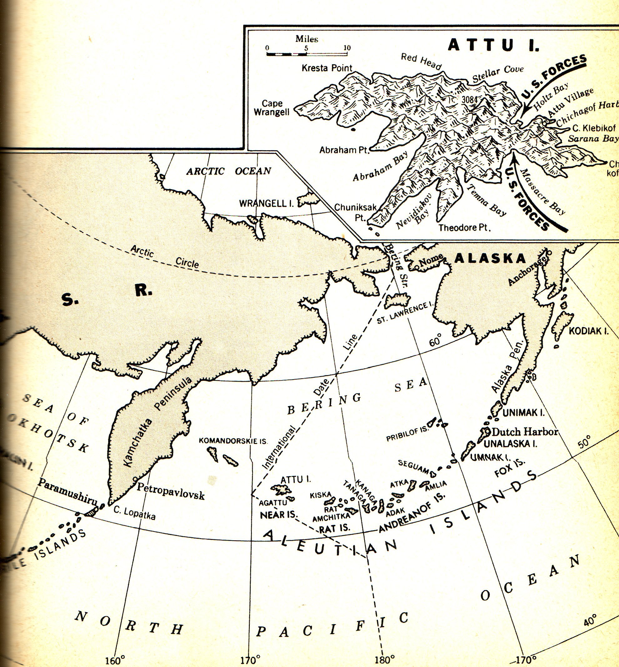 These were islands in the Aleutians, off the coast of Alaska, that the Japanese attacked and occupied for a while during the War. There never seemed to be any organized plan, though, for using these islands to launch attacks eastward against Alaska and maybe the West Coast, unlike American procedure which took islands to build runways to launch planes to take further islands, etc.