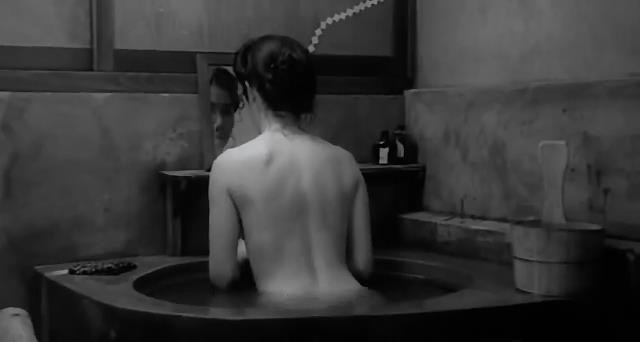 She's taking a bath. The Japanese at that time actually cleaned themselves first outside of the tub. The purpose of the tub was to relax in hot water.