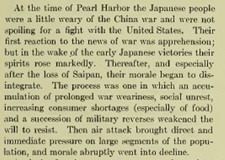 The war in China, which started in 1931, was taken its toll on the people. They didn't necessarily want yet another war, and that with the United States, but once it started and the Japanese forces seem unstoppable their morale went up. Reverses were kept from the people but finally as the Americans got ever closer to Japan, and especially with the bombing raids, the people knew things were not going well.