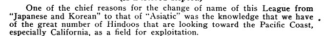 One of the things that had puzzled me was that I had found some reports from the Japanese and Korean Exclusion League. This clears that up; apparently that was that name of the group but they changed it because of the “Hindoos.” Thus, the term “Asiatic” allows them to dislike, officially, a wider range of people than the previous title.