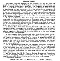 The Clipping Bureau is done a little differently in this section, not doing various specific papers with an article or two from each, but putting everything together. The American Fuel Company has gotten rid of their Japanese workers. Someone from the Semi-Tropic Fruit Exchange says he hates Japanese workers, that they are “entirely untrustworthy.” Various restaurants and clubs are getting rid of Japanese workers, and there's even an article saying that Chicago is being alarmed at the “influx” of Japanese moving into the city.