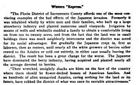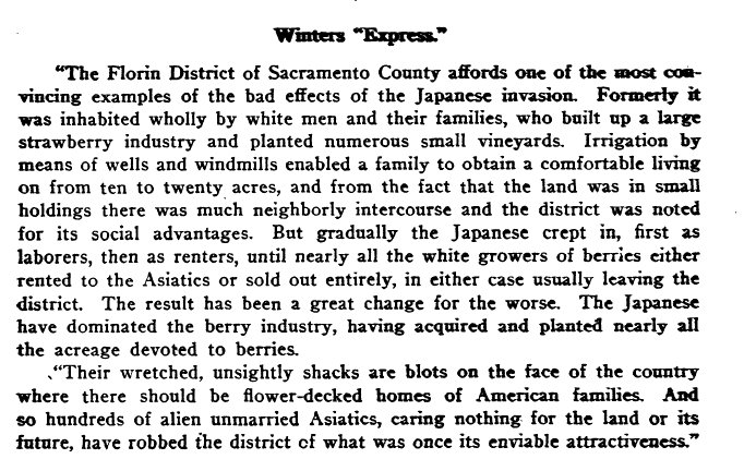 A section about Sacramento Country and the “Japanese invasion” driving out white men and their families.” The Japanese live in “wretched, unsightly shacks” which are “blots on the face of the country where there should be flower-decked homes of American families.”