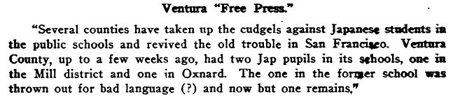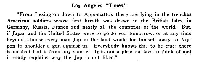 A Los Angeles Times report noting that, if there were to be a war between the U.S. and Japan, all the Japanese immigrants would rush to Japan to take up arms against the U.S.