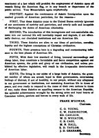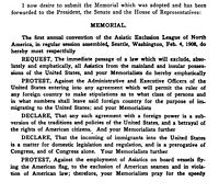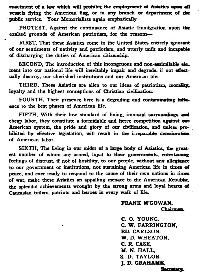 A paper (Memorial) sent to the President of the U.S., the Senate, and the House of Representatives. It wants all Asiatics banned. It says that the Asiatics cannot be assimilated, and that they are “utterly unfit and incapable of discharging the duties of American citizenship. They presence will “impair and degrade, if not effectively destroy, our cherished institutions and our American life.”