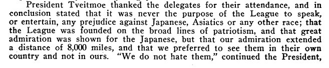The League president claims that the League is not prejudiced against Japanese, Asiatics, or any other race.”