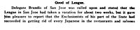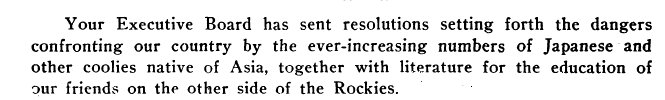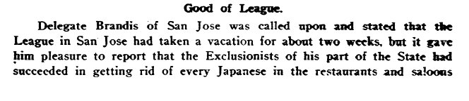 One of the members says “...Exclusionists of his part of the State had succeeded in getting rid of every Japanese in the restaurants and saloons in San Jose.” Not only did the League not want Japanese owning land, but they didn't even want them to have jobs in any businesses owned and run by white men.