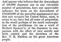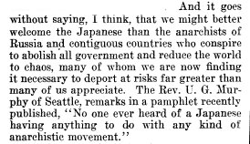 A truly different line of reason. Better Japanese than Russian anarchists. He later talks about some people's fears of the Japanese buying up land or breeding prolifically.
