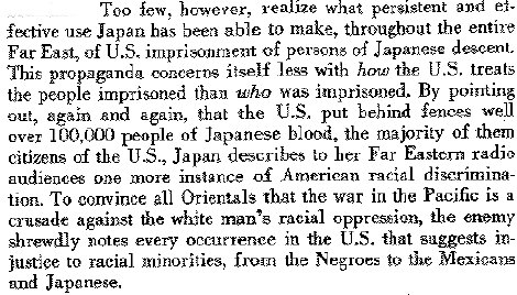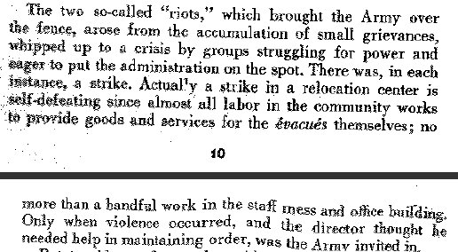 He refers to the troubles in the camps. After that, he discusses the loyalty questionnaire and the segregation of a certain group of the internees. Then he talks about Nisei who were thinking about leaving the camps to live elsewhere, and says that a Nisei “has to muster considerable courage to go out into the society that rejected him two years ago.” “The most powerful magnets to draw him out are letters from friends who have already gone east.”