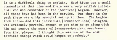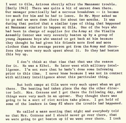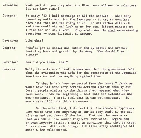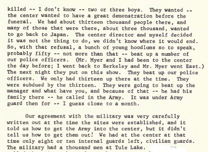 He mentions the trouble at the camps, and has an outlook that no one else had stated. Some of the problem, he says, was caused by the “tough boys from Terminal Island.” He also talks about the various rumors about how the Japanese who were interned were fed better than guys in the Army. The rumors, he says, came from the Hearst papers and other sources and were, of course, untrue.