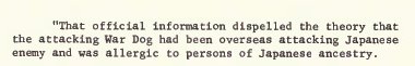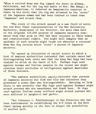 There is another section that I have not read elsewhere. Apparently there was a rumor that the Army had trained attack dogs for use in the Pacific, and after the war they were being let loose to attack Japanese-Americans who had moved back to California.