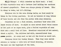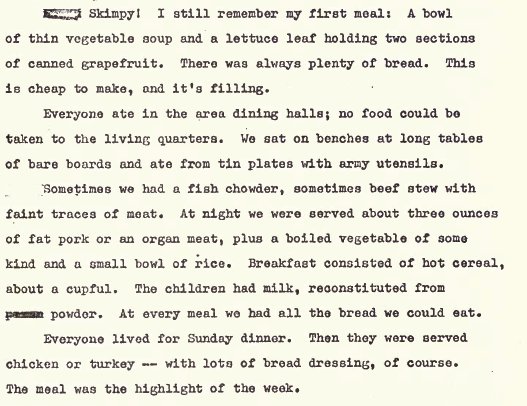 She was there for a week. She says the living quarters were “Ugly barracks buildings covered with tarpaper.” She adds that there was o plumbing, and sanitary facilities were in a separate building. Drinking water was in a bucket on the table, and there was a single bare light globe hung from the center of the ceiling.