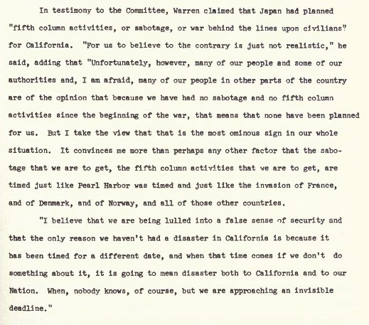 This is the origin of his “logic” statement that, since there had been no sabotage, it was PROOF that there was sabotage being planned by persons of Japanese ancestry on the West Coat. In other words, if you have never stolen, then that is absolute PROOF that you plan to steal.