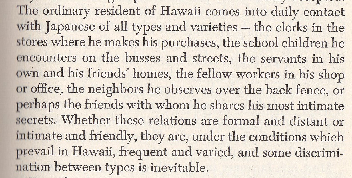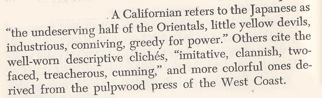 This is not a throw-away bit of information. If people come into contact with other races on a daily basis, this will, in all probability, help over time to lower racial prejudice. On the Pacific Coast at the time, whites generally did not have frequent contact with Japanese, so it was easier to hate what they had never seen.