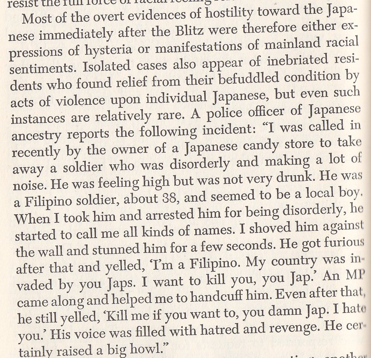 Attacks against the Japanese on Hawaii were the result of hysteria or mainland feelings. Drunkenness led to some attacks, but being drunk can lead to attacks on anyone. The Filipinos had a particular dislike for the Japanese after the Philippines were invaded and conquered by the Japanese military.