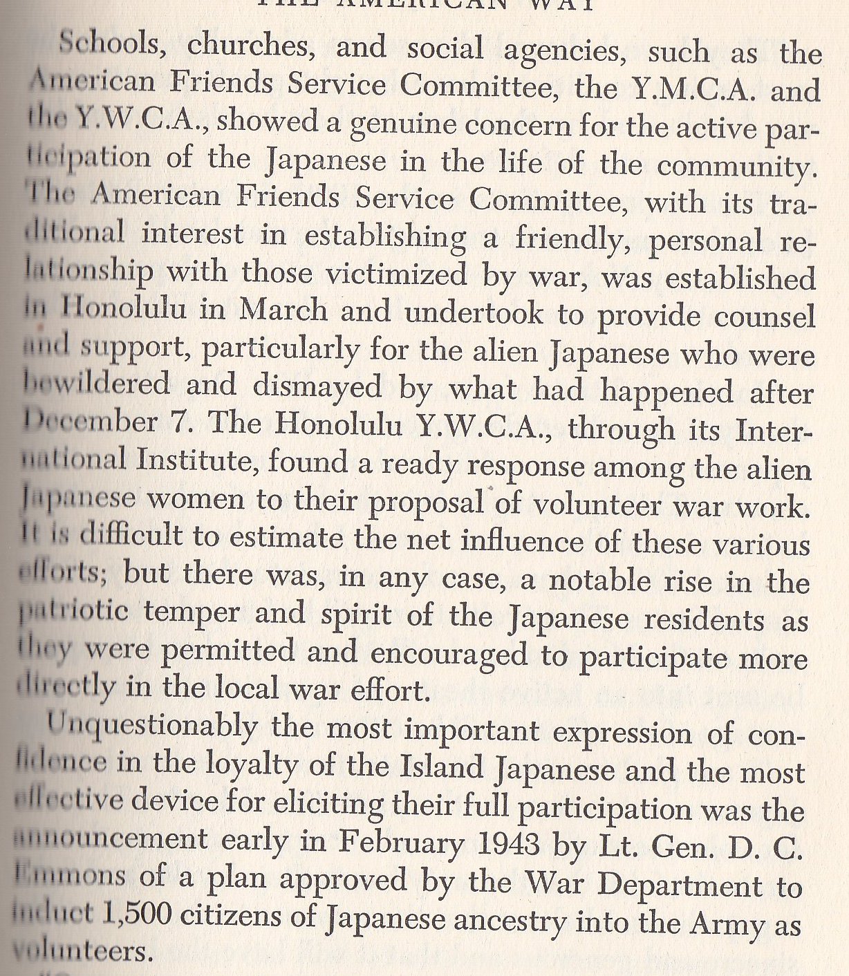 The author then goes into the program for getting Nisei to join the American military. The non-Japanese could get behind this, also. For those who liked the Japanese, it showed them what they knew all along, that the Japanese on the islands were loyal Americans who would fight for their country. For those who didn't like the Japanese, it allowed them to say, basically, that if the Japanese are as good as they claim to be, and like America as much as they claim, then let them prove it. A win-win position.