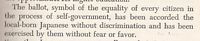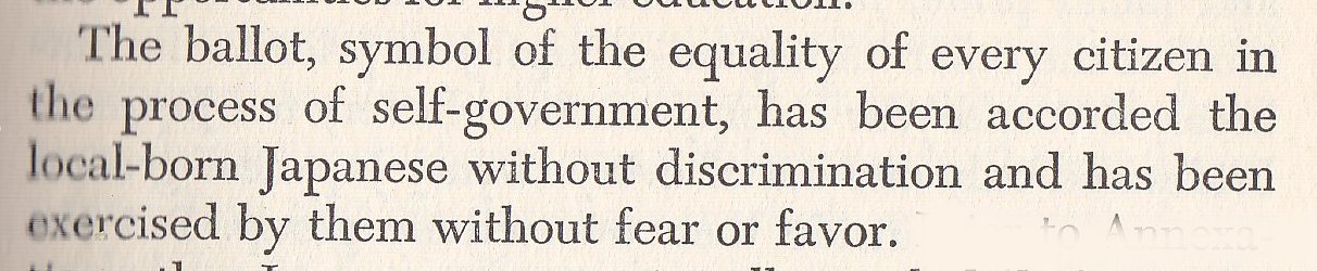 The Nisei were also allowed to vote. Again, this is of critical importance, because if someone feels that they have no say at all over what happens, they will become bitter and more likely angry towards those in power. People who can have a direct say over who the politicians are will be much more likely to actually care about who is “ruling” them and many will take a more active interest in what is actually going on in their area.
