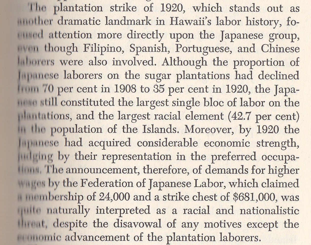 Another reason not to kick the Japanese out was their economic importance to the island. I'll repeat the numbers here, the job being first and second the percentage of workers in that job who were Japanese: