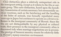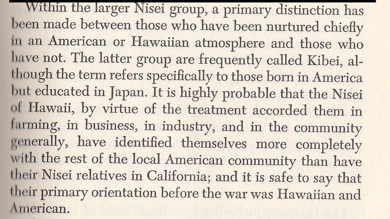 The Nisei are divided into two groups, depending on whether they have stayed in Hawaii or in the U.S. all their lives, or whether they were born here, then returned at some point to Japan for schooling. The ones who stayed her the entire time seem to have adapted much better to the American culture.