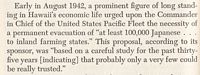 Another intelligent Army individual, saying that there haven't really been any problems with the Japanese, no one's planning to kick them out to internment camps, but, just the same, the Army is keeping its eye on them. It's a statement to mollify those made nervous by the presence of the Japanese on the islands, but also mollify the same Japanese somewhat. Everyone gets treated equally, and is innocent until proven guilty. On the mainland, of course, the persons of Japanese ancestry were considered guilty until proven innocent which, incidentally, they really weren't in a position to do until well into the internment period.