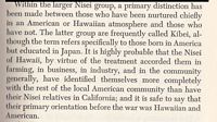 The author goes on to talk about the Japanese language schools, and the opposition that existed to them. He then talks about the various Japanese papers and other things that irritated the whites, but also points out that, as the Nisei generation grew, they became more “Americanized,” and the importance of Japanese papers and radio broadcasts from Japan shrank. The Nisei were not totally turning their backs on their heritage, but Japanese culture was no longer as important to them as it was to their parents.
