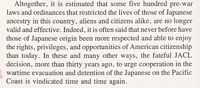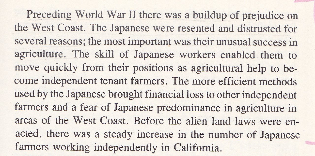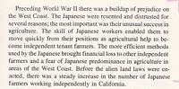 Notice: there were some 500 laws and ordinances aimed directly at the PJAs on the West Coast. I don't think any other single group has had so many legal attacks aimed directly at them; at least definitely not since the blacks were slaves in the South, and I'm not sure the number of laws and ordinances against them reached the 500 mark.