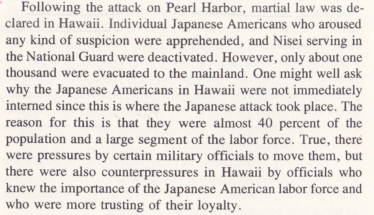 He notes that the PJAs of Hawaii were not evacuated, and then talks about how Earl Warren and Walter Lippmann played major roles in the West Coast evacuations.