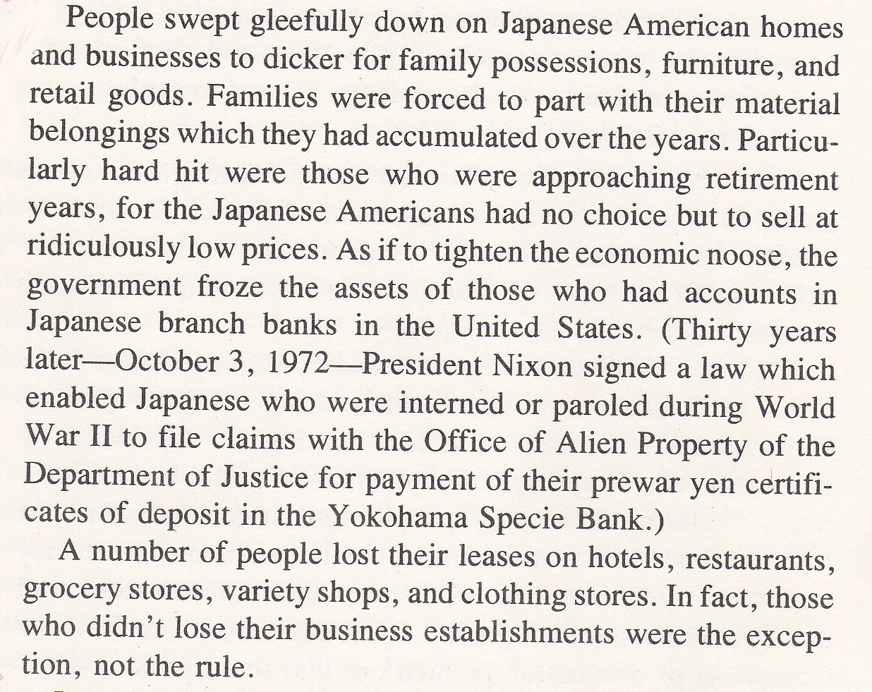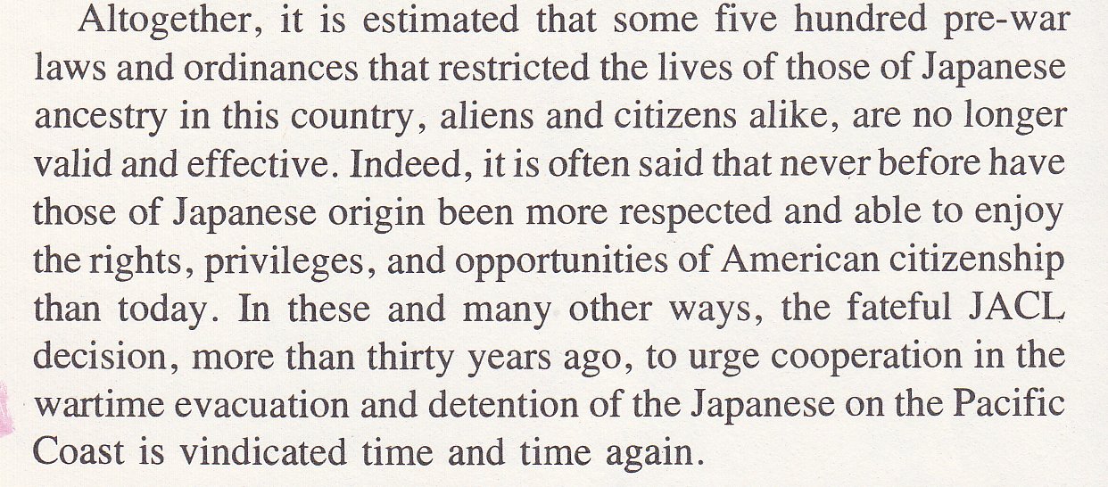 The next chapter is about the JACL and from someone involved with it. The JACL was about the only organization left that could represent the PJAs, as most of the rest of the Japanese American organizations had been effectively neutralized by the government during its arrest of organization leaders.