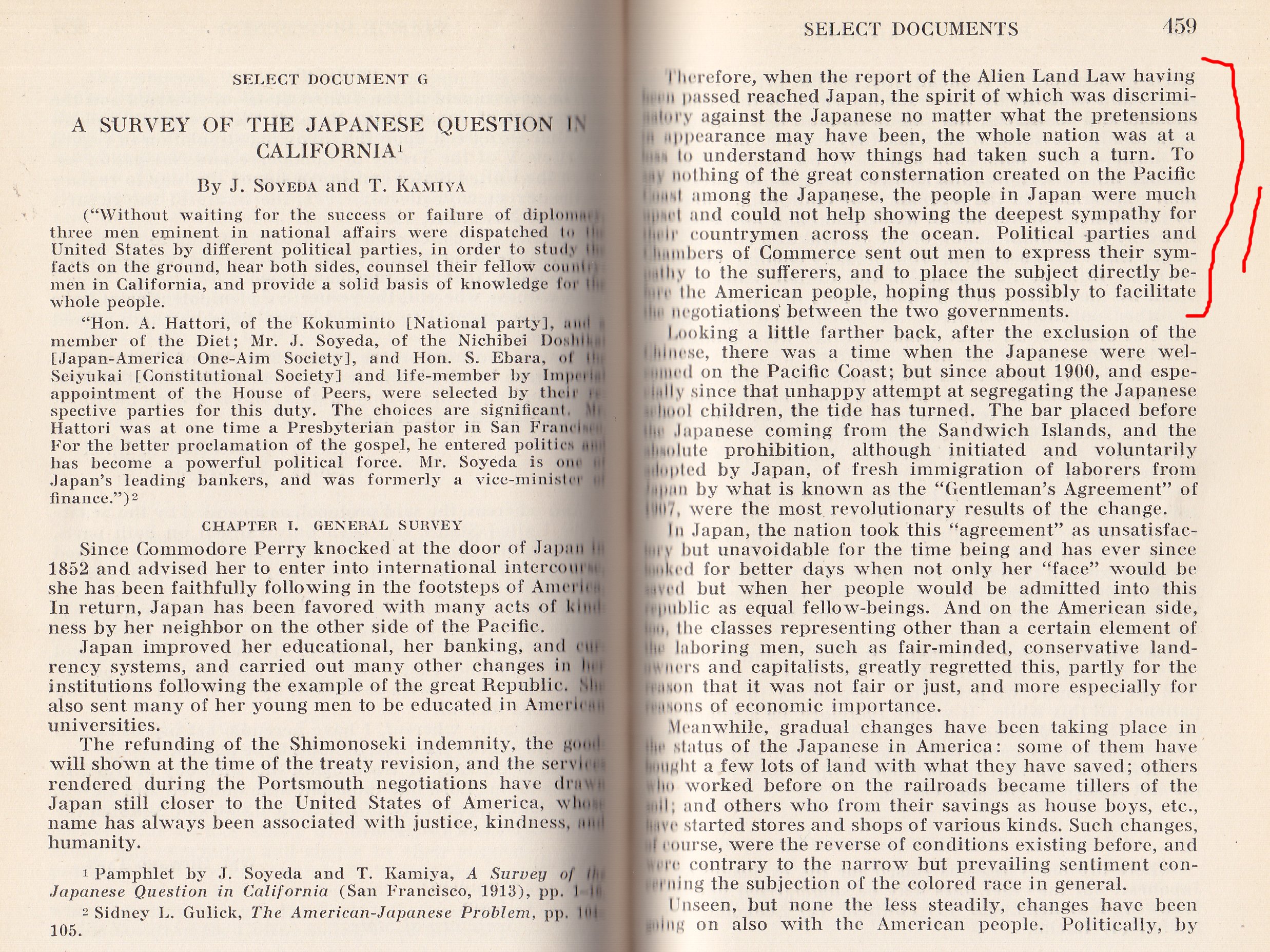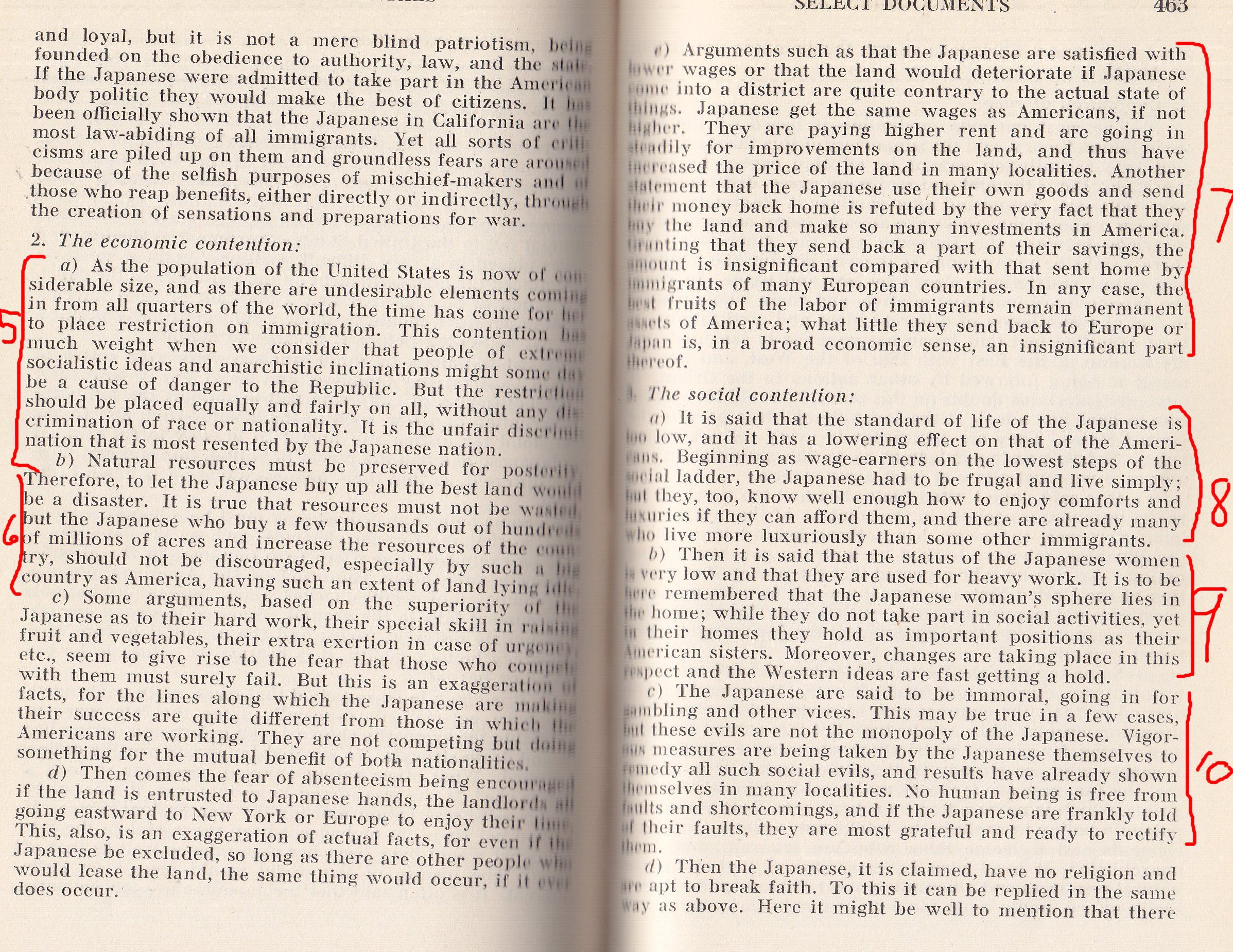 (5) They are saying that it is fine if the U.S. restricts immigration as long as it treats are nationalities equally. The Japanese were being singled out for exclusion (as had been the Chinese earlier) and this is what is actually bothering them, that they are the specific targets for exclusion. (6) There's a lot of unused land in the U.S., and it doesn't harm anything to let Japanese buy some of it. (7) They deal with “the Japanese work for next to nothing” argument. (8) The argument that the Japanese live in a very simple matter is met by the basic answer that everyone has to start out somewhere, and it's usually at the bottom. They work their way up, and then can afford to get more things. (9) The argument that Japanese women do hard work in the fields. It's a matter of Japanese culture that things were done that way, but Americans hadn't studied Japanese culture to see how they approached things differently. (10) The argument that the Japanese are immoral is met by saying that a few are, but so are a few of any other group of people.