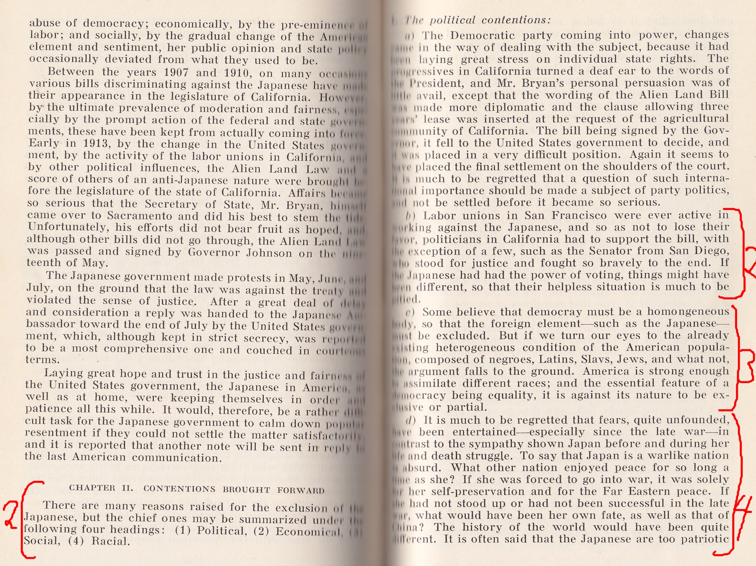 (2)They summarize the objections to Japanese immigrants. (2)Labor unions were anti-Japanese. (3) America is already heterogeneous, consisting of many different cultures. (4) They say Japan is not a warlike nation. This was not that long before the Japanese invasion of China, though.