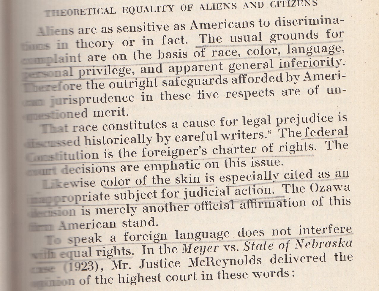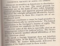 Within that section the author discusses “Theoretical equality of aliens and citizens.” I think this is a good analysis. (By the way, some scans will be blurry on one side; the book was small and tightly bound, and it was hard getting scans without running a chance of damaging the book, which I didn't want to do.)