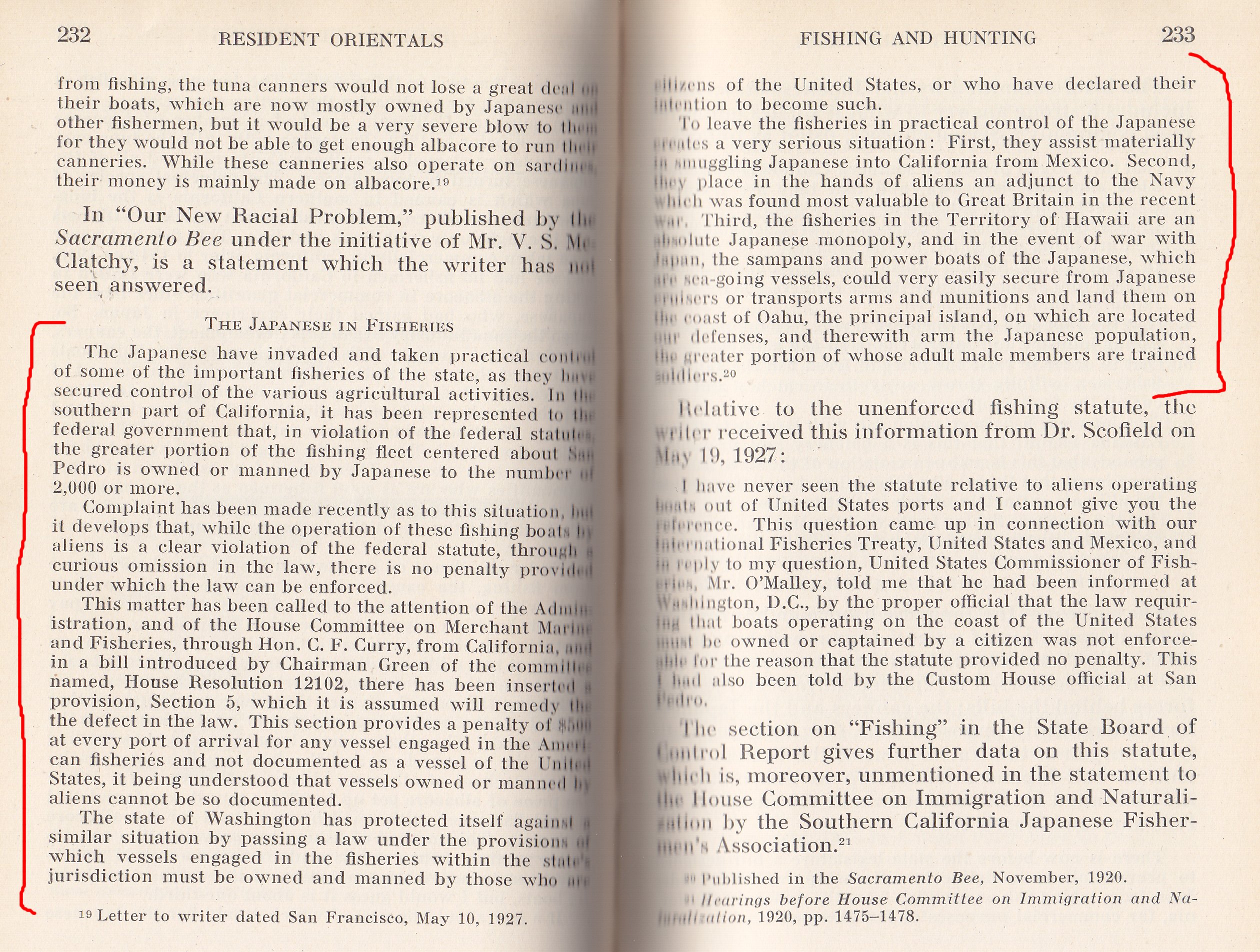 Later, he talks about California anti-Japanese groups, and mentions the California Joint Immigration Committee, which was the successor to the “defunct exclusion leagues.” The main person cited is McClatchy, owner and editor of the Sacramento Bee.