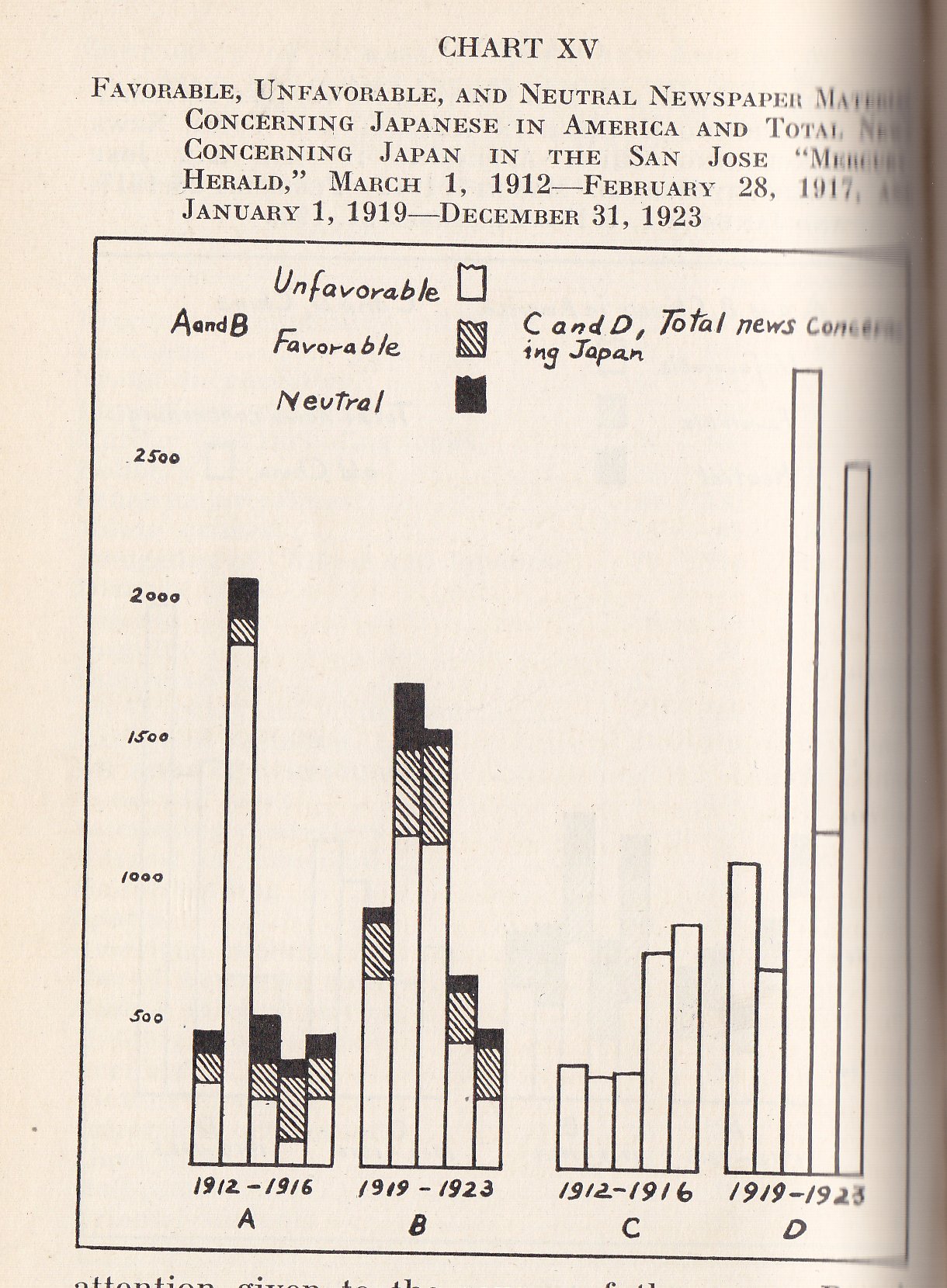 In a chapter called “Community Contacts” he takes a look at newspaper coverage of the Japanese in America. Sections A and B deal with articles relating to Japanese in the U.S; sections C and D deal with Japan itself, where, according to this chart, 100% of the coverage was negative. There was a very high proportion of negative articles dealing with Japanese in America, although there were some positive articles, and some neutral. Again, this is an advantage of getting a book written at the time of the events or shortly thereafter, since it might go into much more detail than a modern-day book about the same topic.