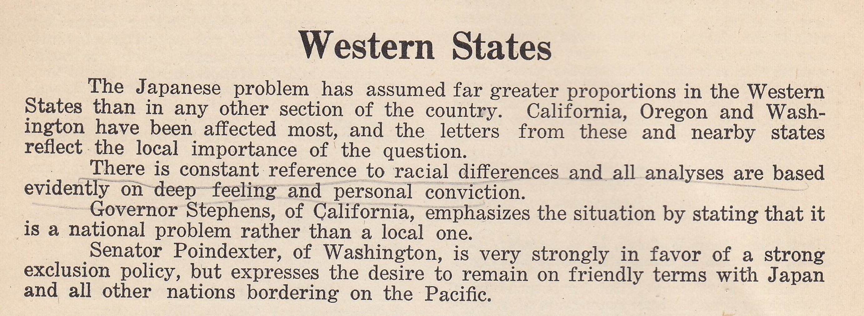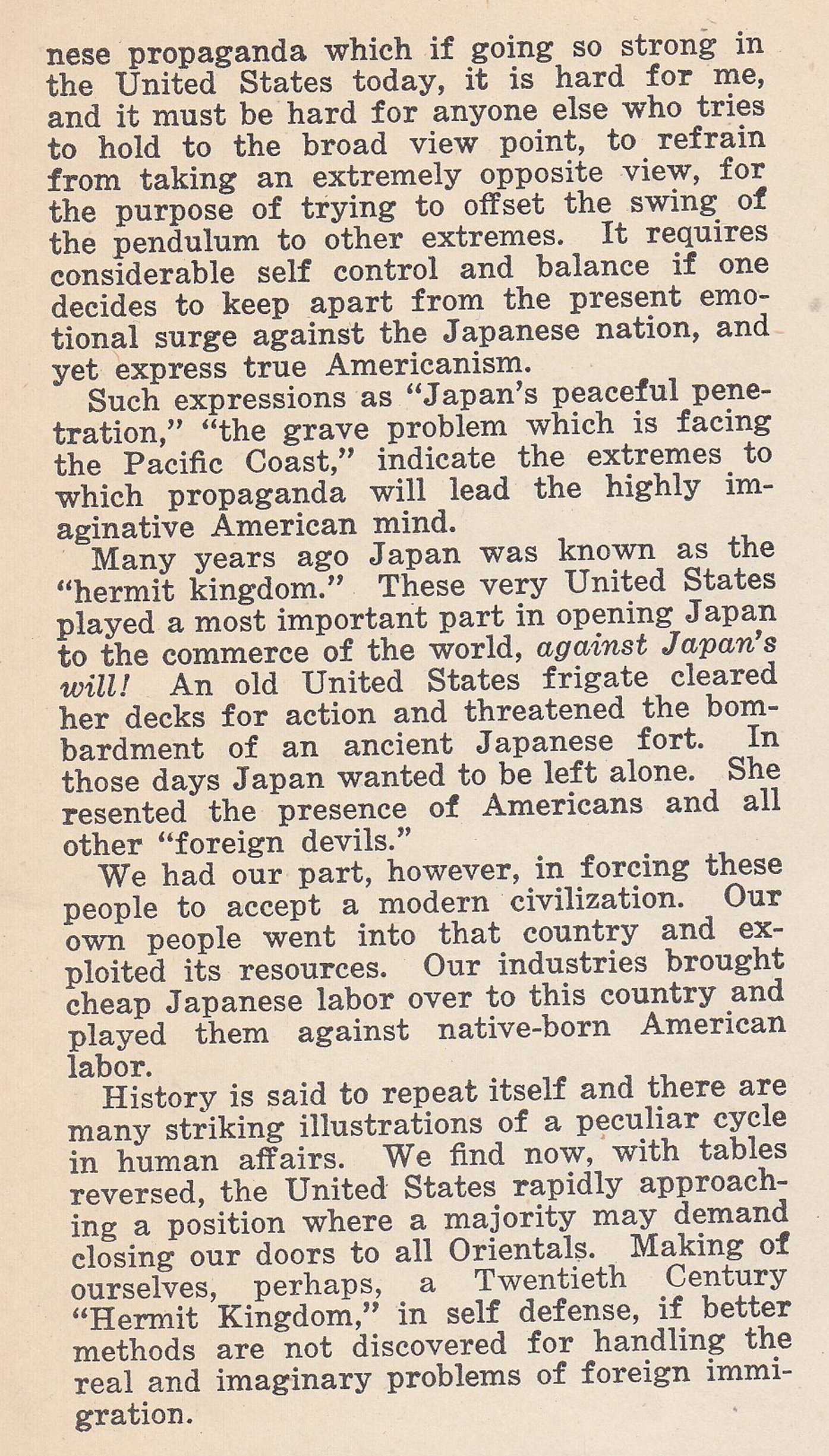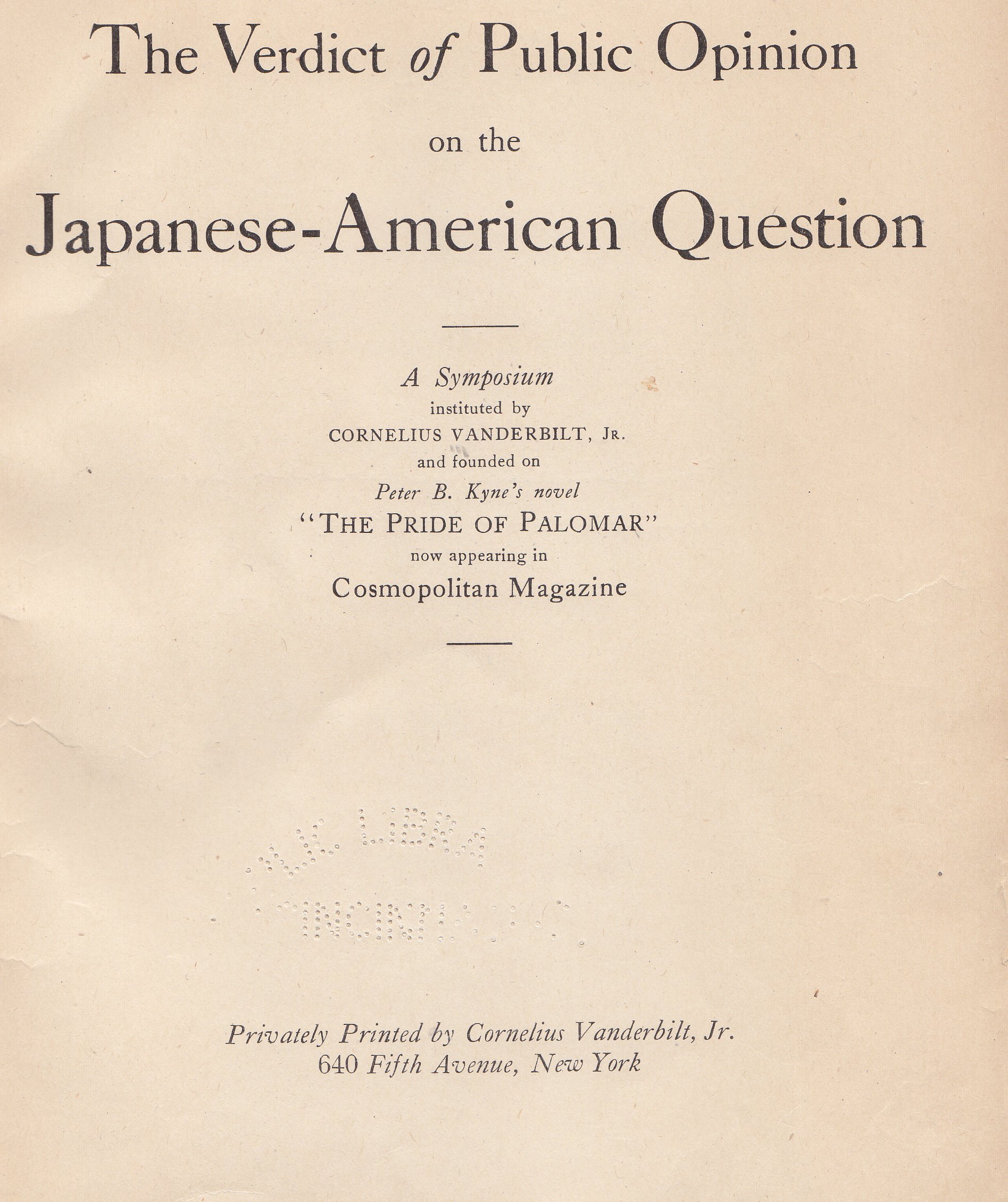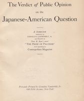 1921. What the author has done with this book is to sample public opinion across the United States about the Japanese. He divides the work into sections based on the part of the U.S. that he covers, and then includes the opinions from a variety of people. It's obvious that the author is anti-Japanese. It's also interesting to note how many college presidents were against the Japanese at the time.