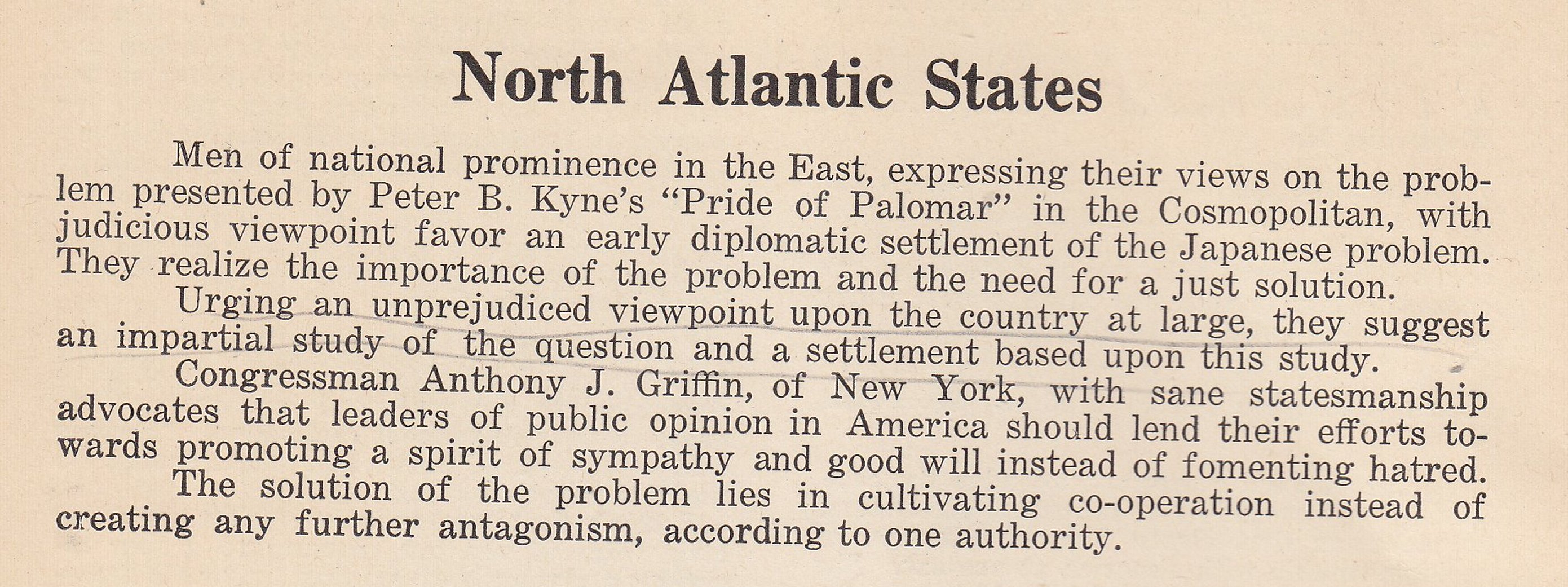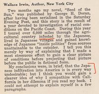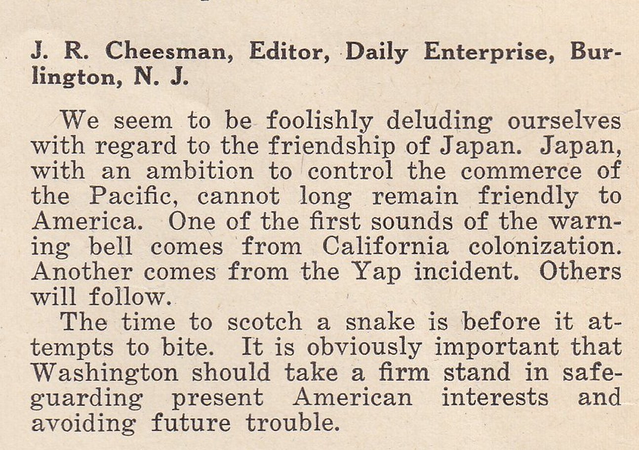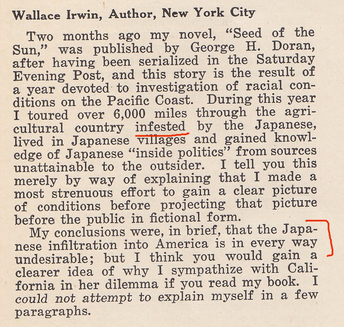 1921. What the author has done with this book is to sample public opinion across the United States about the Japanese. He divides the work into sections based on the part of the U.S. that he covers, and then includes the opinions from a variety of people. It's obvious that the author is anti-Japanese. It's also interesting to note how many college presidents were against the Japanese at the time.