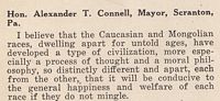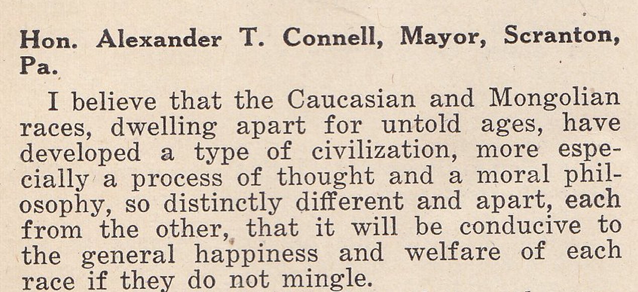 The mayor of Scranton, Pennsylvania, is definitely anti-Japanese, holding that the Oriental and the Caucasian races cannot successfully mix.