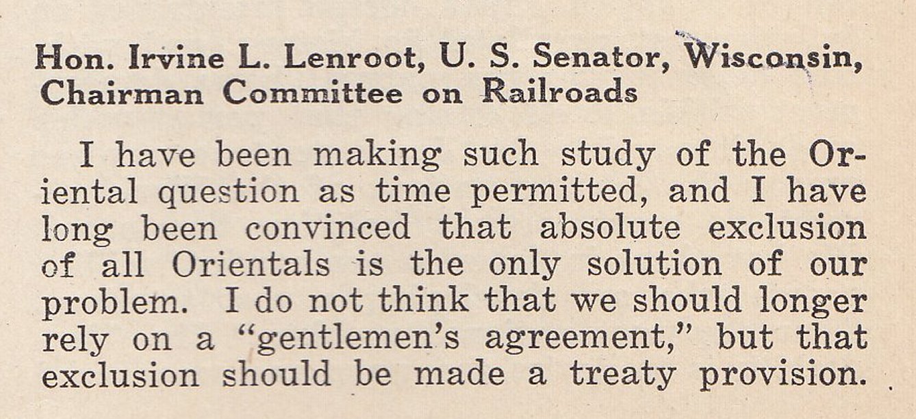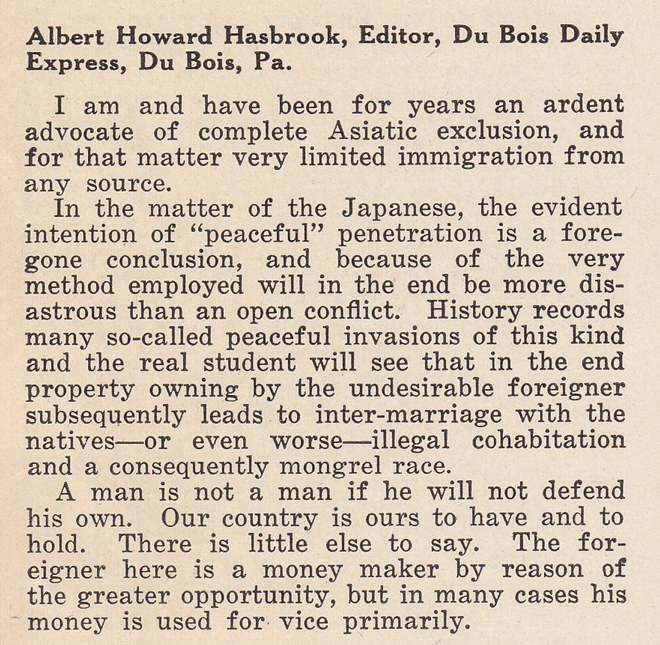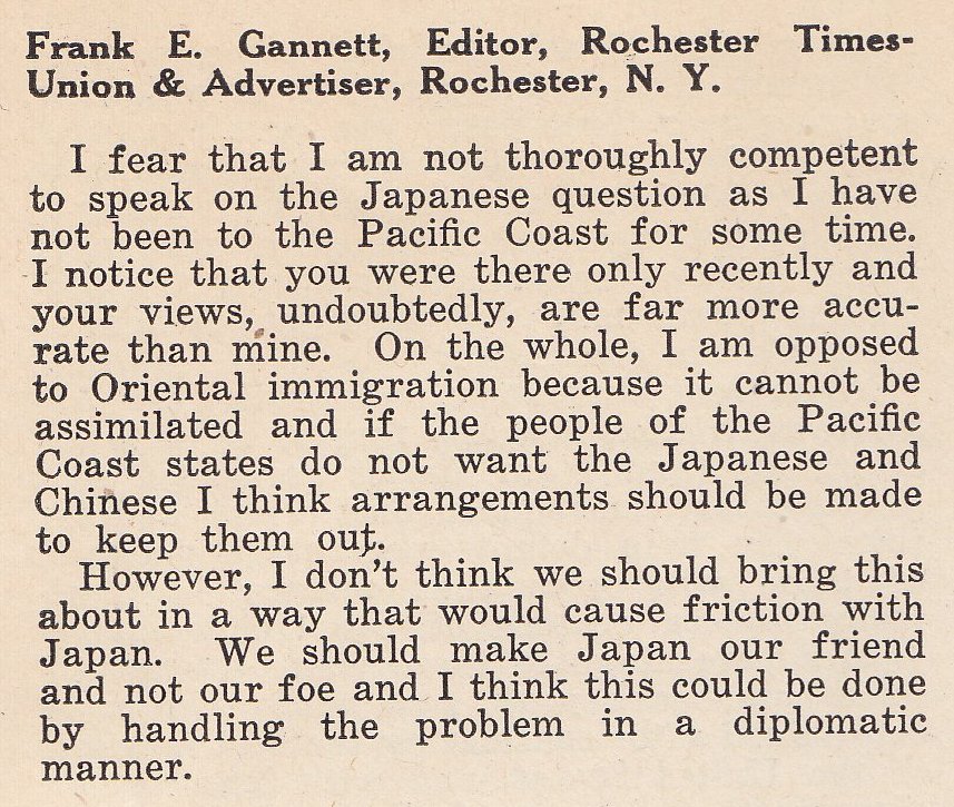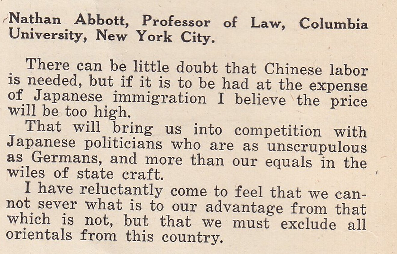 Figuring out where people stand on the issue of Japanese immigrants and exclusion laws isn't as easy at it might seem. A lot of these people seem to be politicians, trying to be as vague as they can be in their answers.