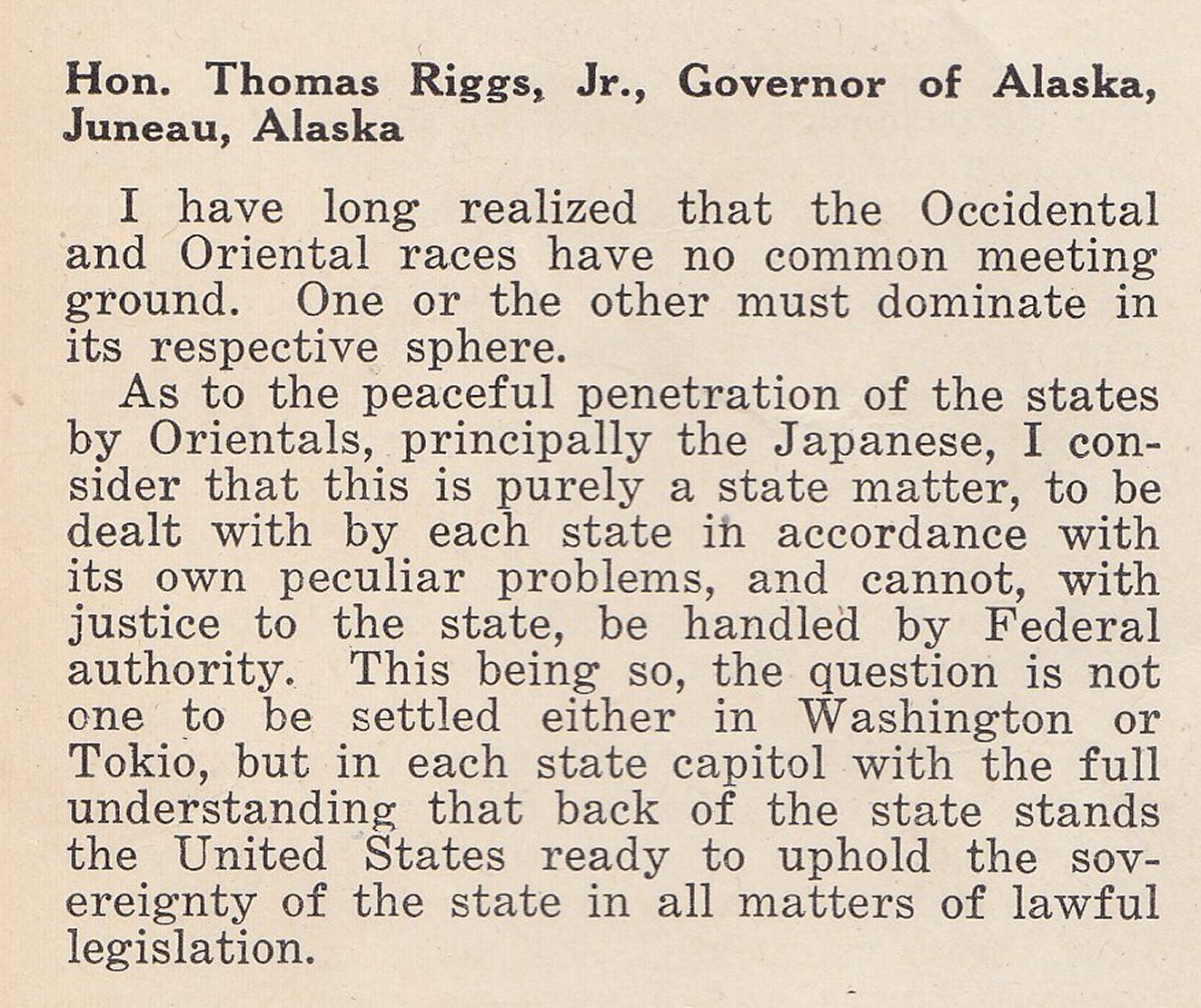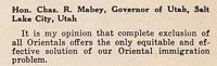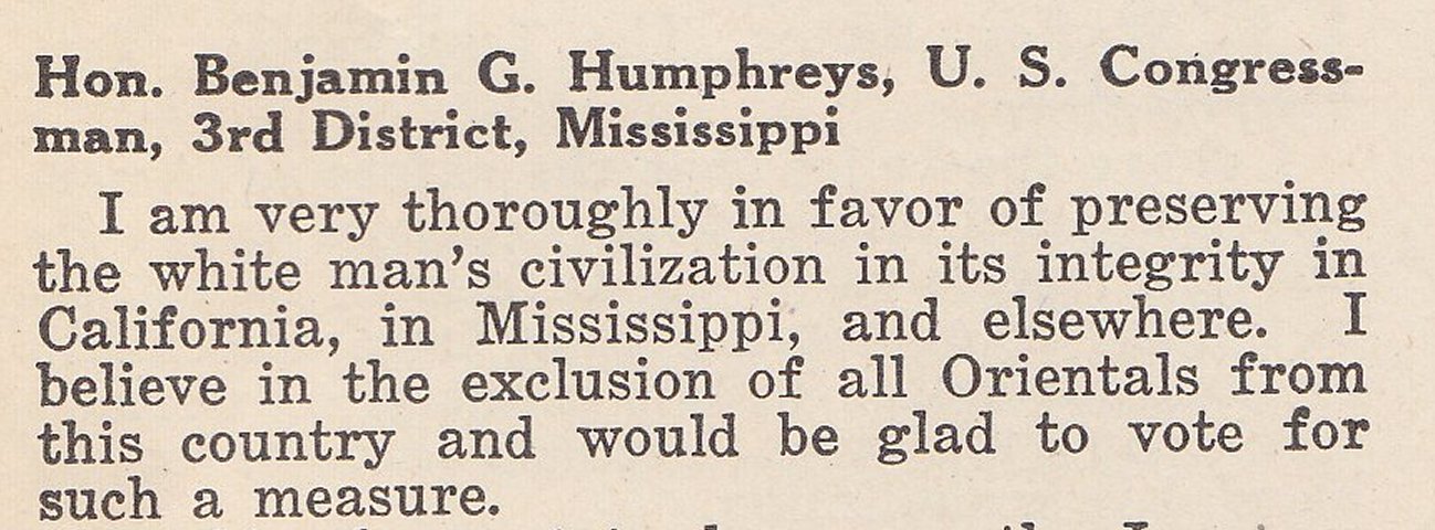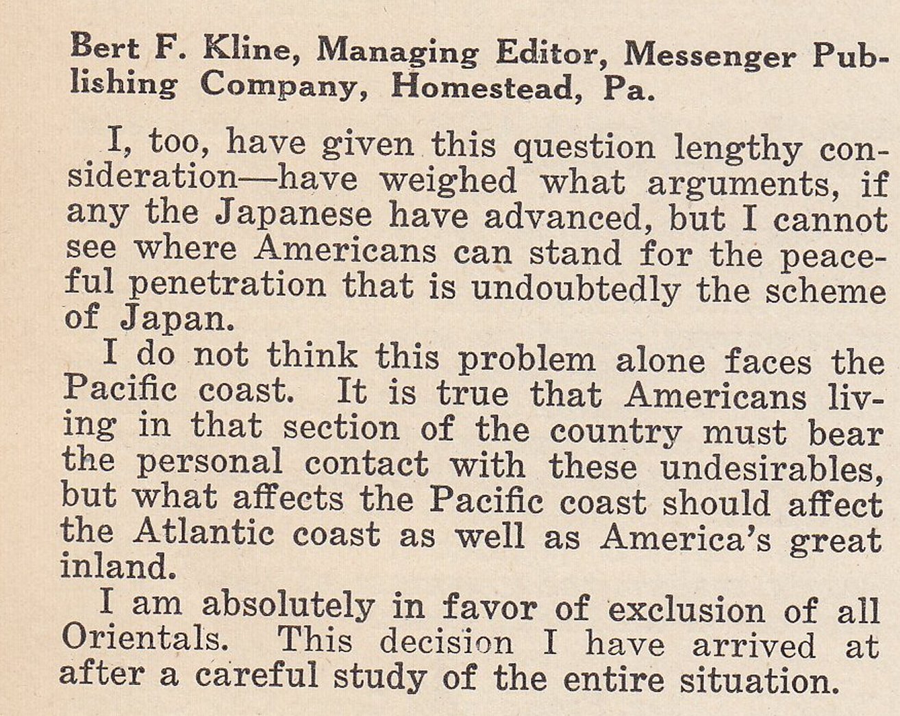 Figuring out where people stand on the issue of Japanese immigrants and exclusion laws isn't as easy at it might seem. A lot of these people seem to be politicians, trying to be as vague as they can be in their answers.